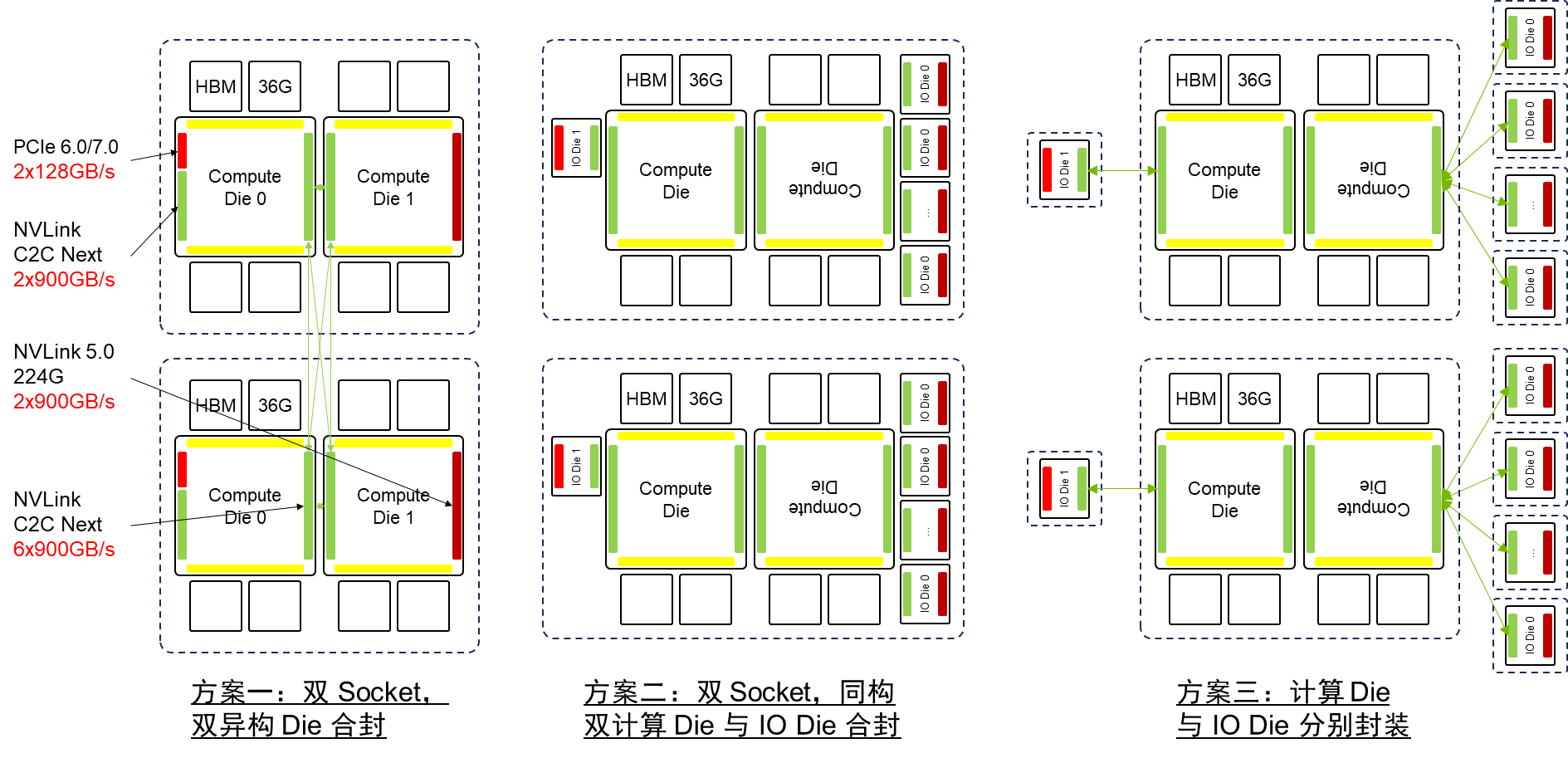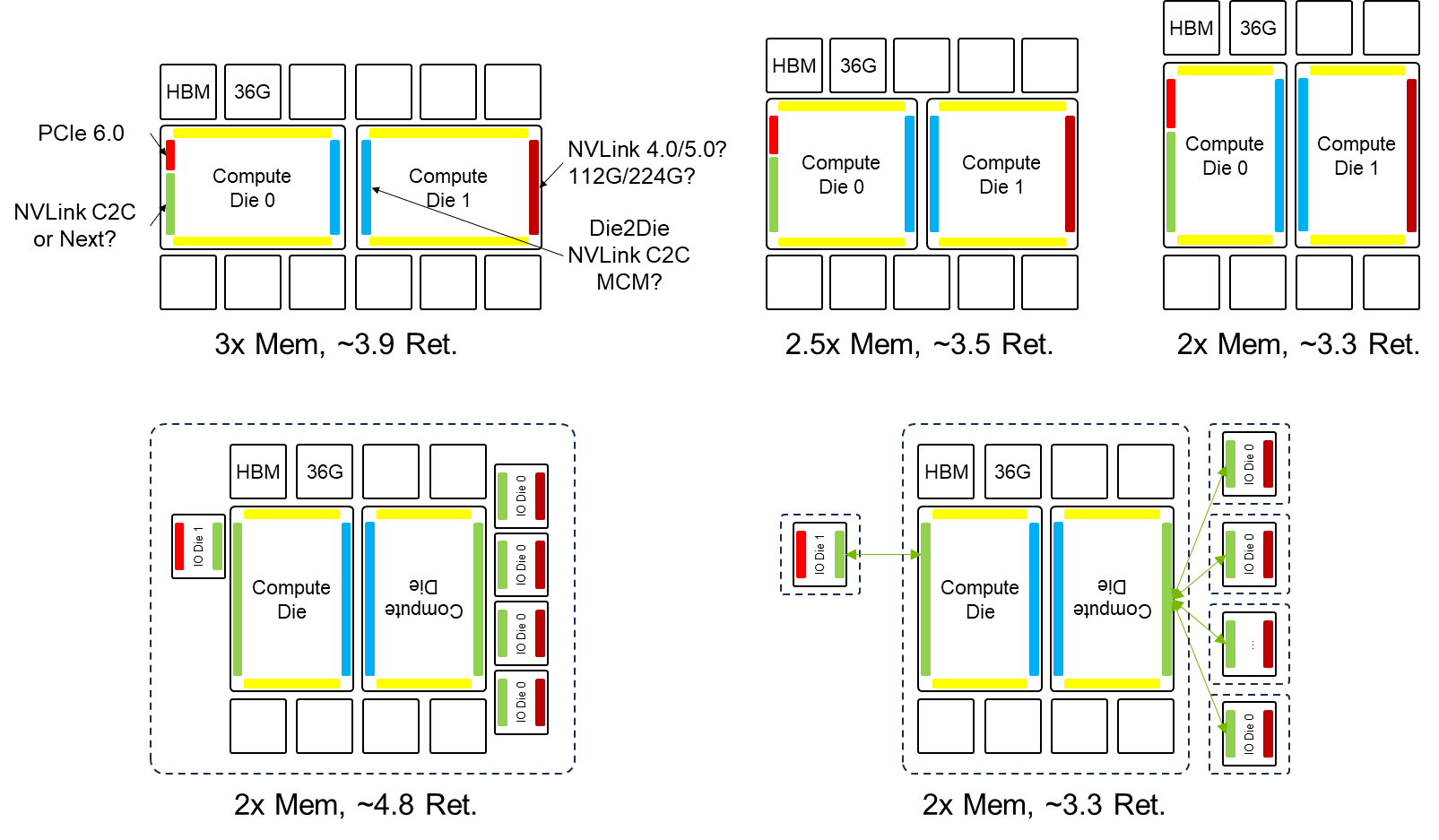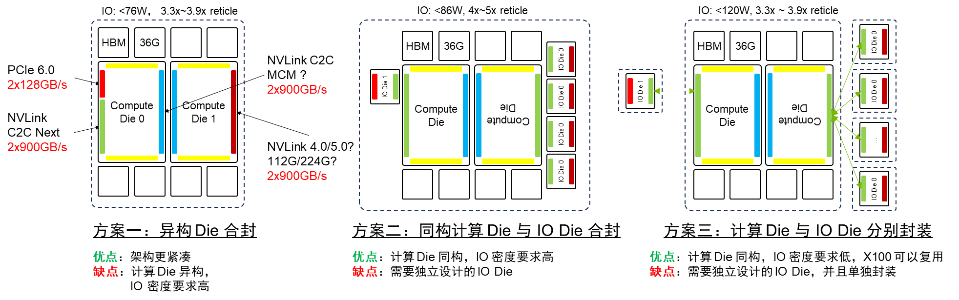 在满足2025年的工程约束的前提下,X100也可以采用SuperChip超级芯片架构在B100双Die架构的基础上进行平面扩展。在这种情况下,Nvidia X100 也有“异构 Die 合封”,“同构计算 Die 与 IO Die 合封”,“计算 Die 与 IO Die 分别封装”三种架构选项。如果采用封装间互联的超级芯片的扩展方式,先进封装的基板面积约束将不再会是瓶颈,此时只需要增强NVLink C2C的驱动能力。