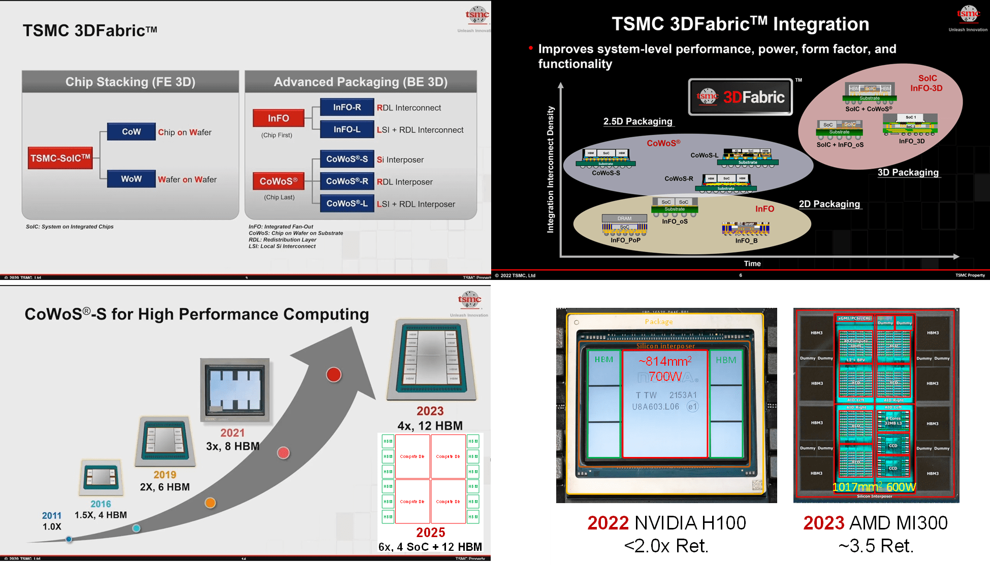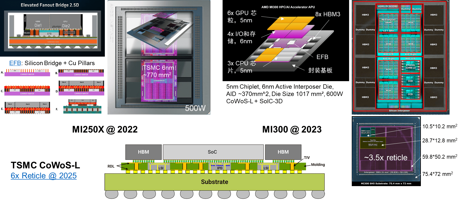 TSMC的CoWoS先进封装工艺封装基板的尺寸在2023年为4倍Reticle面积,2025年将达到6倍Reticle面积 [19]。当前Nvidia H100 GPU的封装基板尺寸小于2倍Reticle面积,AMD的MI300系列GPU的封装基板尺寸大约为3.5倍Reticle面积,逼近当前TSMC CoWoS-L工艺的极限。