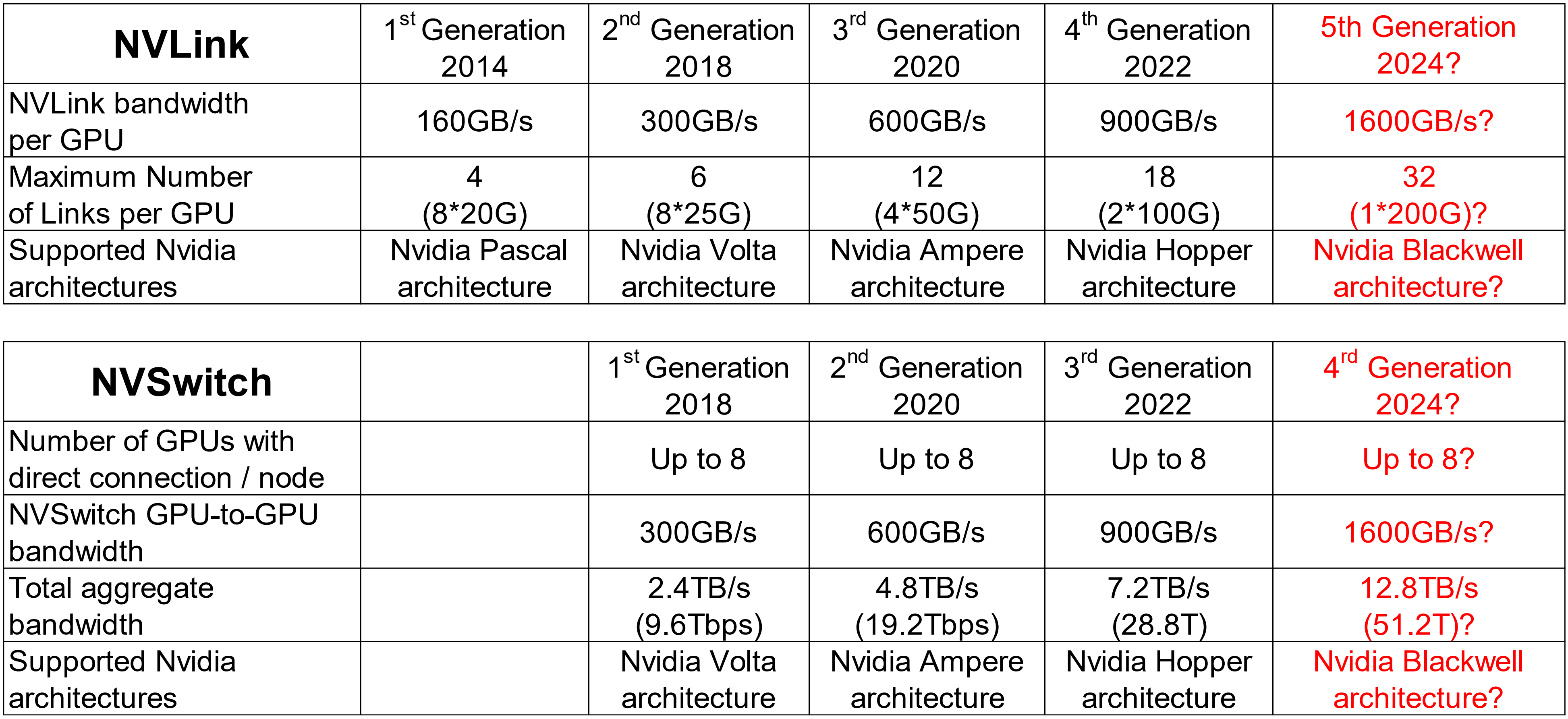 从NVLink和NVSwitch的演进来看,每一代速率会是上一代的1.5到2倍。下一代NVLink5.0大概率会采用200G每通道,每个GPU能够出的NVLink接口数量从18个增加到32个,甚至更高。而NVSwitch4.0在端口速率达到200G以外,交换芯片的端口数量可能在NVSwitch3.0交换芯片64端口的基础上翻2倍甚至4倍,总交换容量从12.8T到25.6T甚至51.2T [30]。
