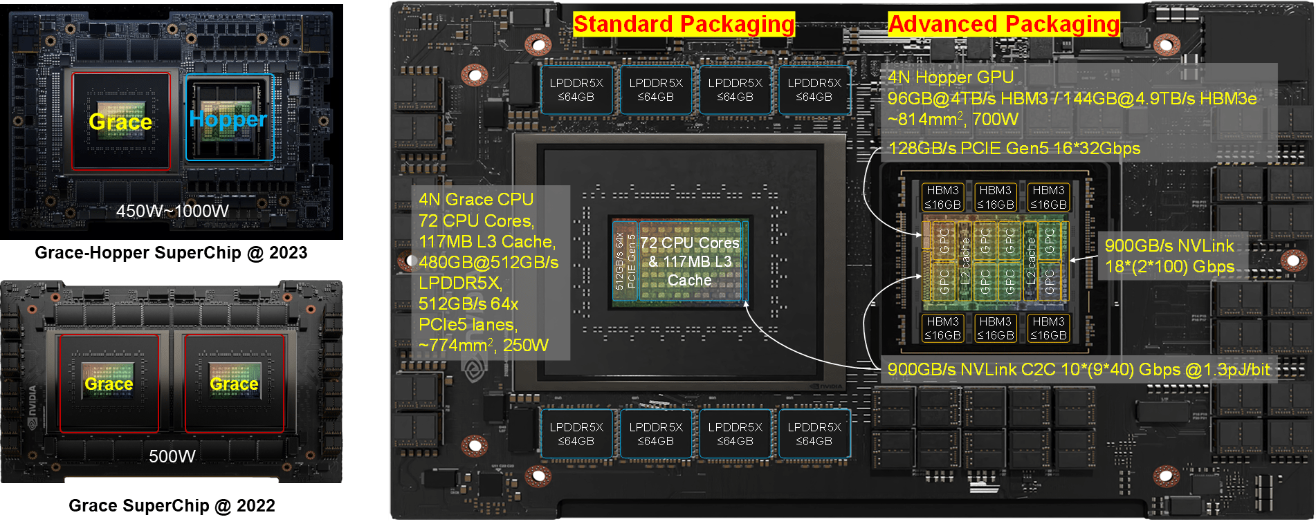 3. 如果X100采用单Socket封装,四个异构Die合封装的方式,需要在计算Die上堆叠HBM,同时需要先进封装的基板达到6倍Reticle面积。但是,如果采用SuperChip超级芯片的方式组成双Socket封装模组,可以避免计算Die上堆叠HBM,并放松对先进封装基板面积的要求,此时需要对NVLink C2C的驱动能力做增强。