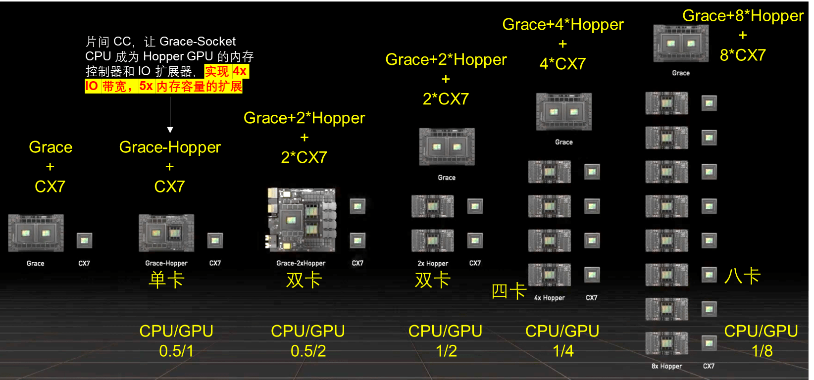 NVLink 和 NVLink C2C 技术提供了更灵活设计,实现了 CPU 和 GPU 灵活配置,可以构建满足不同应用需求的系统架构。NVLink C2C 可以提供灵活的CPU、GPU算力配比,可组成 1/0,0.5/1,0.5/2,1/4,1/8 等多种组合的硬件系统。NVLink C2C支持Grace CPU和Hopper GPU芯片间内存一致性操作 (Cache-Coherency),让 Grace CPU 成为 Hopper GPU 的内存控制器和 IO 扩展器,实现了 4倍 IO 带宽和5倍内存容量的扩展。这种架构打破了HBM的瓶颈,实现了内存超发。对训练影响是可以缓存更大模型,利用ZeRO等技术外存缓存模型,带宽提升能减少Fetch Weight的IO开销。对推理影响是可以缓存更大模型,按需加载模型切片推理,有可能在单CPU-GPU超级芯片内完成大模型推理 [23]。