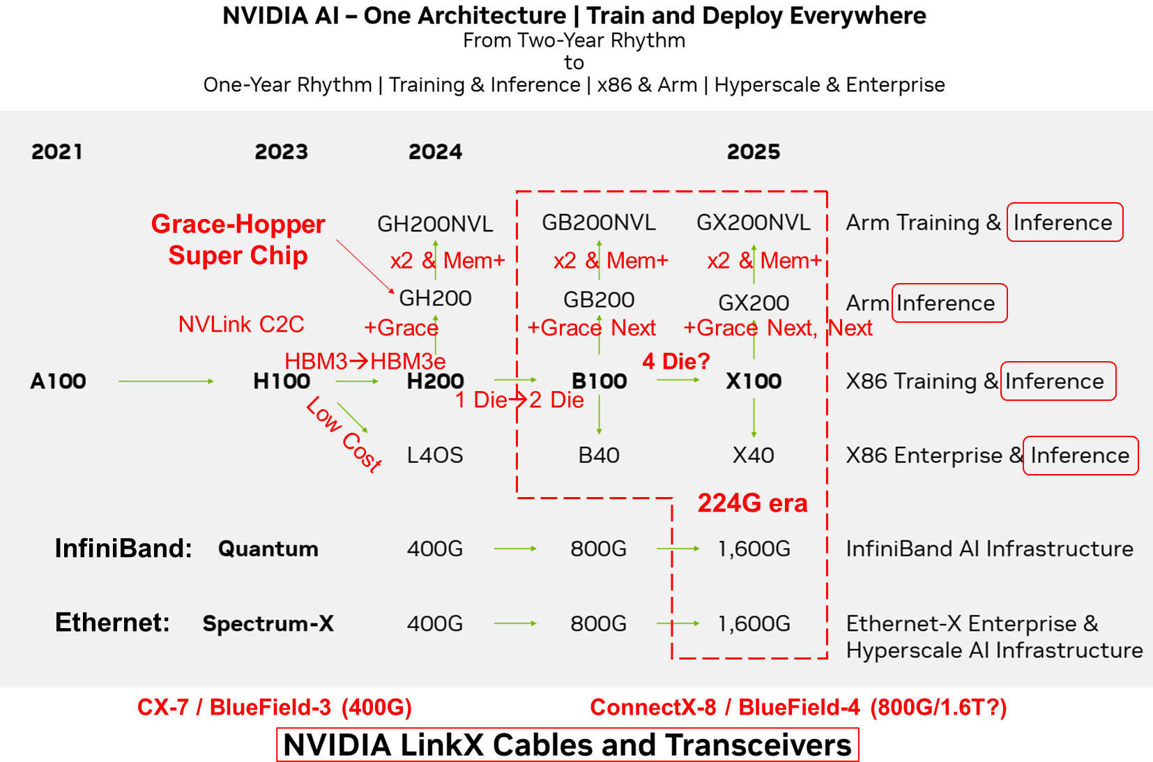 本文尝试从第一性原理出发,对Nvidia的AI芯片发展路线进行了深入分析和解读,并对未来的B100和X100芯片架构进行了推演预测。并且,希望通过这种推演提取出未来AI计算系统对互联技术的新需求。