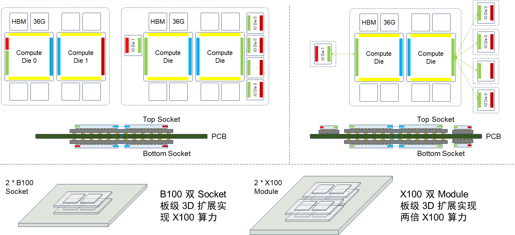 2. B100将采用双Die架构。如果采用异构Die合封方式,封装基板面积将小于当前先进封装4倍Reticle面积的约束。而如果采用计算Die和IO Die分离,同构计算Die和IO Die合封的方式,封装基板面积将超出当前先进封装4倍Reticle面积的约束。如果采用计算Die和IO Die分离,同构计算Die和IO Die分开封装的方式,则可以满足当前的工程工艺约束。考虑到B100 2024年推出的节奏,以及计算Die在整个GPU芯片中的成本占比并不高,因此用异构Die合封方式的可能性较大。