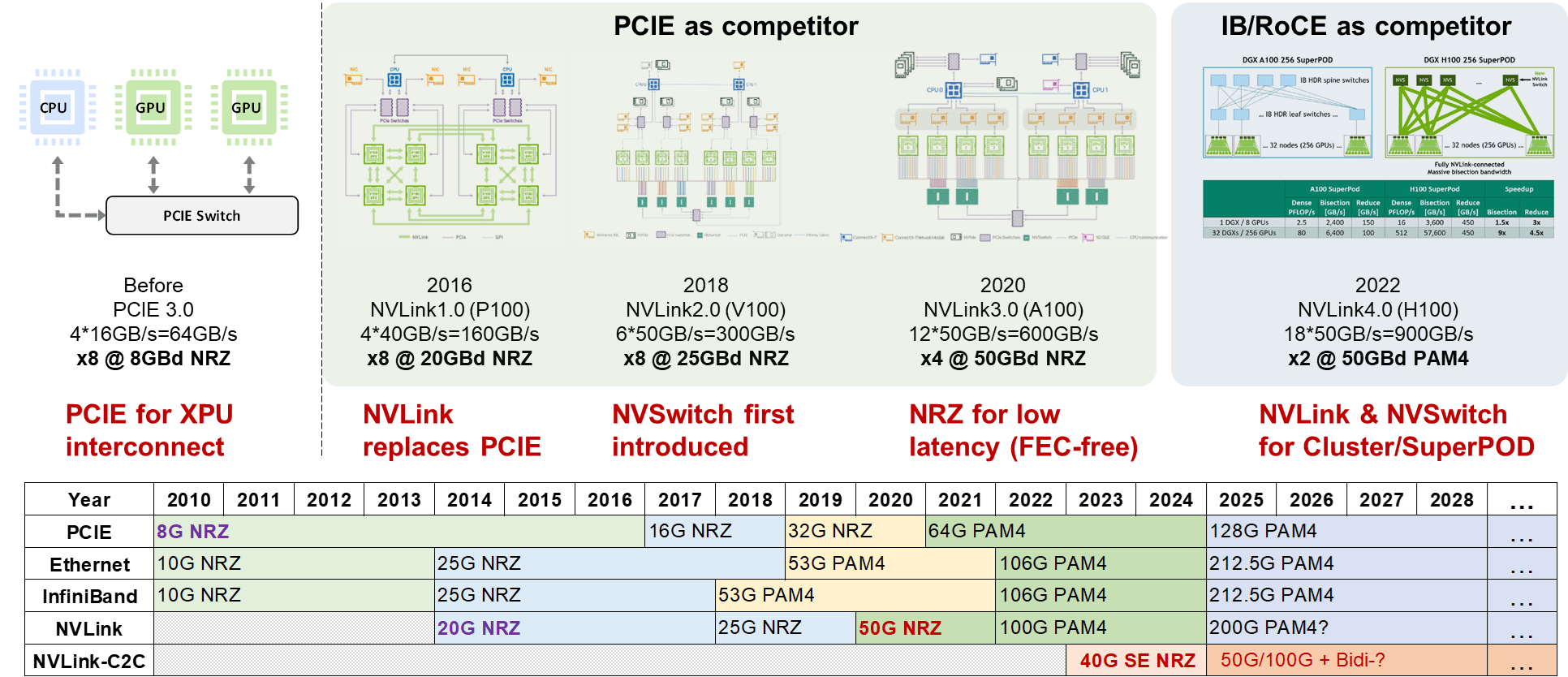 值得注意的是,NVLink并未完全遵循Ethernet的互联技术规范。例如,在50G NVLink3.0采用了NRZ调制,而不是Ethernet所采用的PAM4调制 [30]。这意味着NVLink3.0利用了100Gbps PAM4 SerDes代际的技术,并通过采用更低阶NRZ调制来实现链路的无误码运行,免去FEC实现低时延。同样以低时延著称的InfiniBand在50G这一代际则完全遵从了Ethernet的PAM4调制,这在一定程度上使其在50G这一代际丧失了低时延的技术优势,市场不得不选择长期停留在25G代际的InfiniBand网络上。当然,InfiniBand网络也有其无奈之处,因为它需要复用Ethernet光模块互联生态,所以它必须完全遵循Ethernet的互联电气规范,而与之对应的NVLink3.0则只需要解决盒子内或机框内互联即可。同样的事情也会在100G代际的NVLink4.0上发生,NVLink4.0完全摆脱了盒子和框子的限制,实现了跨盒子、跨框的互联,此时为了复用Ethernet的光模块互联生态,NVLink4.0的频点和调制格式也需要遵从Ethernet互联的电气规范。以前InfiniBand遇到的问题,NVLink也同样需要面对。在100G时代,可以观察到Ethernet、InfiniBand和NVLink的SerDes速率在时间节奏上齐步走的情况。实际上,这三种互联接口都采用了完全相同的SerDes互联技术。同样的情况在200G这一代际也会发生。与InfiniBand和Ethernet不同的是,NVLink是一个完全私有的互联生态,不存在跨速率代际兼容、同代际支持多种速率的接口和多厂商互通的问题。因此,在技术选择上,NVLink可以完全按照具体应用场景下的需求来选择设计甜点,在推出节奏上可以根据竞争情况自由把控,也更容易实现差异化竞争力和高品牌溢价。