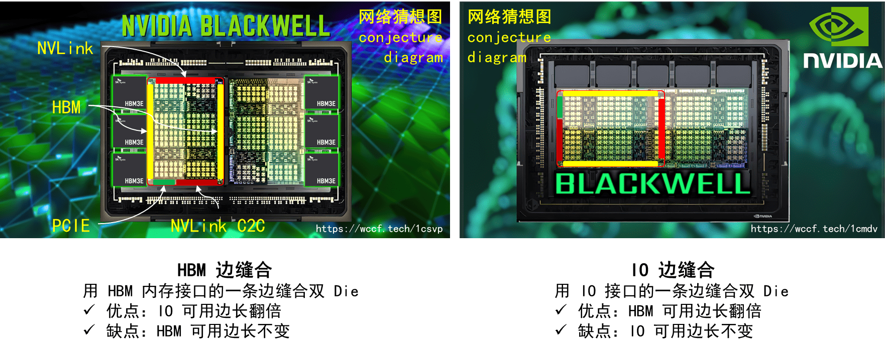 H100不具备旋转对对称性,而双Die的B100仍需支持 GH200 SuperChip 超级芯片,因此B100可能由两颗异构 Die组成。按照不同的长宽比采用“IO边缝合的方式”B100 的面积达到3.3到3.9倍的Reticle面积,小于当前TSMC CoWoS先进封装能够提供的4倍Reticle面积的能力极限。计算 Die 之间互联可以复用 NVLink C2C 互联技术,既利用 NVLink C2C出封装的连接能力覆盖Die间互联的场景。