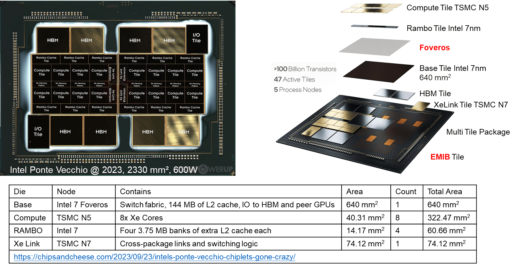 Intel Ponte Vecchio GPU将Chiplet和先进封装技术推向了极致,它涉及5个工艺节点(包括TSMC和Intel两家厂商的不同工艺),47个有源的Tile,并同时采用了EMIB 2.5D和Foveros 3D封装技术。可以说,它更像是一个先进封装技术的试验场。Intel 的主力AI芯片是Gaudi系列AI加速芯片 [27][28][29]。值得注意的是Gaudi系列AI芯片是由TSMC代工的Gaudi 2采用的是TSMC 7nm工艺,Gaudi 3采用的是TSMC 5nm工艺。