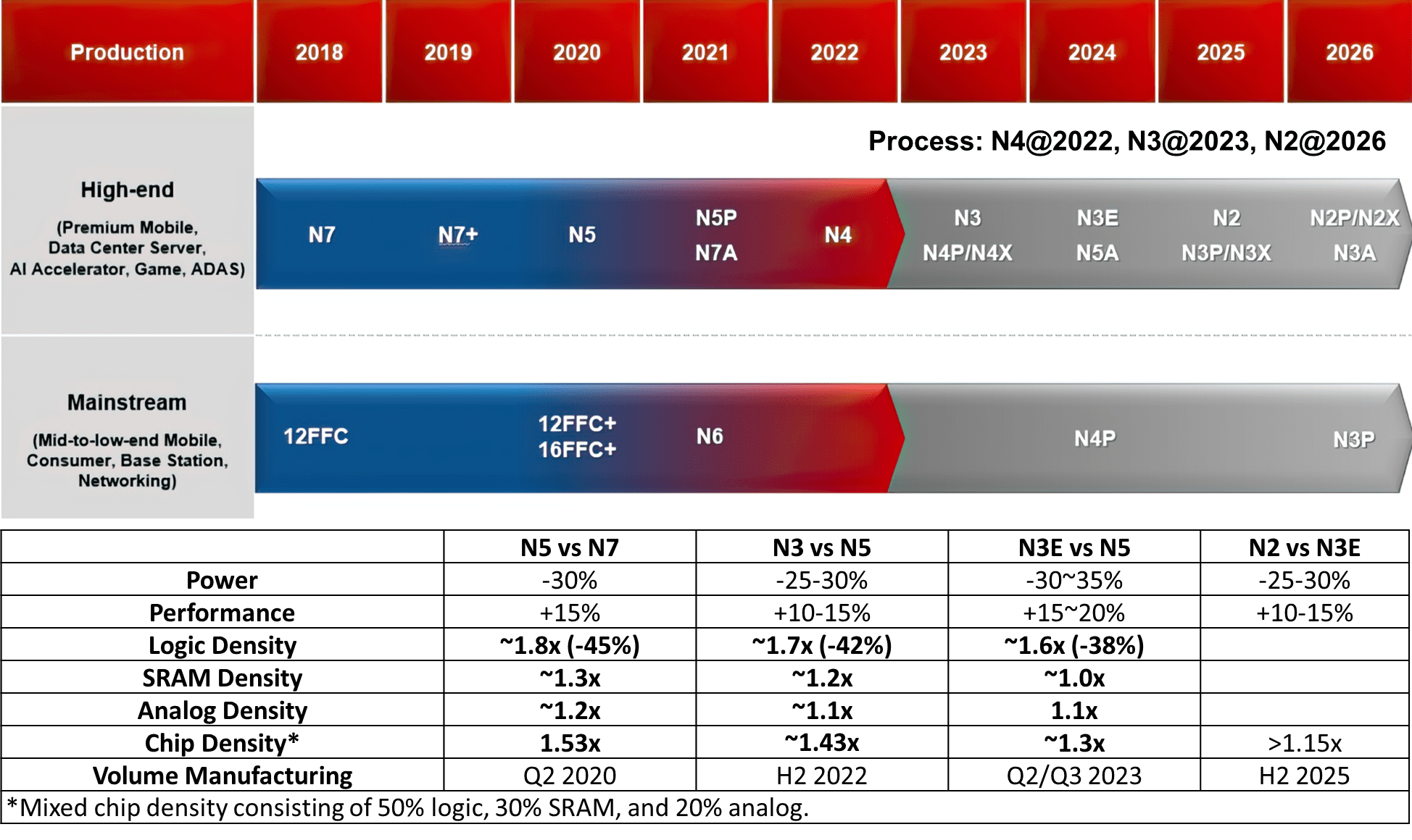按照TSMC给出的工艺演进路标,2023~2025年基本以3nm工艺为主,2nm工艺在2025年以后才会发布。3nm技术已经进入量产阶段,N3工艺和N3E版本已经于2023年推出。2024年下半年开始生产N3P版本,该版本将提供比N3E更高的速度、更低的功耗和更高的芯片密度。此外,N3X版本将专注于高性能计算应用,提供更高的时钟频率和性能,预计将于2025年开始量产 [18]。工艺演进的收益对于逻辑器件的收益小于50%,因此,未来单芯片算力提升将更依赖于先进封装技术。