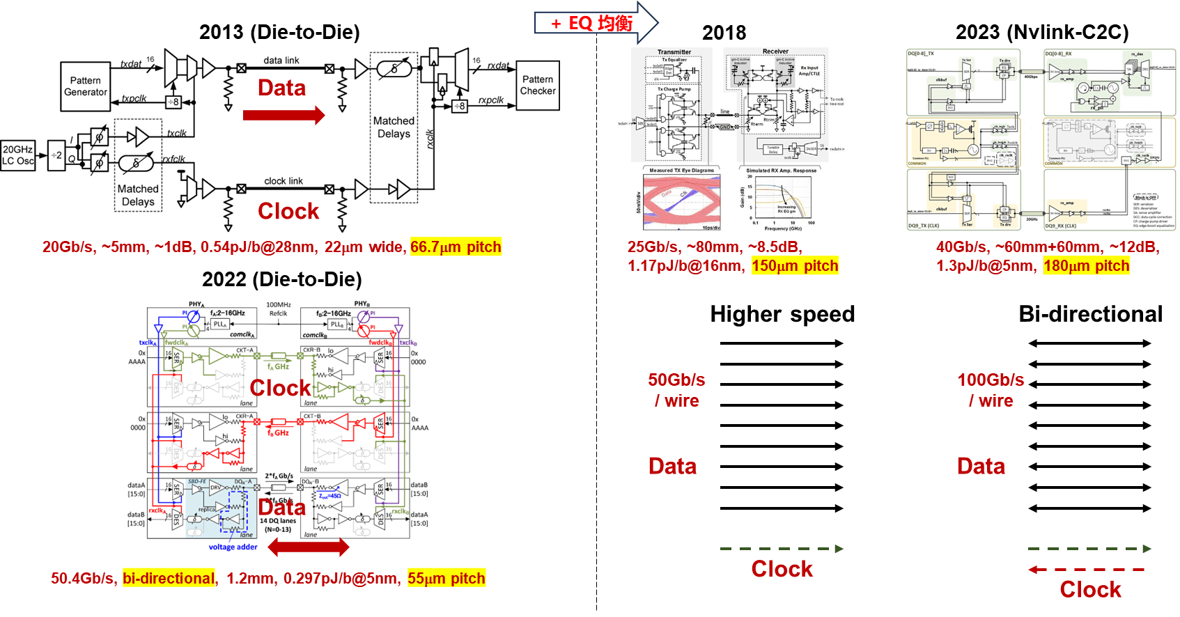 基于NVLink C2C的产品目前只有GH200这一代,但是从Nvidia在该领域公开发表的论文中可以大致看出其技术发展的脉络。从技术演进上看,它是封装内Die间互联的在均衡上的增强。从Nvidia SuperChip超级芯片路标来看,它将在未来的AI芯片中继续发挥重要作用。对于这类接口,仍需保持连接两个独立封装芯片的能力和极低的时延和功耗。当前的NVLink C2C采用9*40Gbps NRZ调制方式。未来NVLink-C2C可能会向更高速率和双向传输技术方向演进。而50G NRZ是C2C互联场景下在功耗和时延方面的设计甜点。继续维持NRZ调制,选择合适工作频率,走向双向传输将是实现速率翻倍的重要技术手段。虽然NVLink C2C针对芯片间互联做了优化设计,但由于它与标准SerDes之间不存在速率对应关系,无法实现与标准SerDes之间比特透明的信号转换,因此其应用场景受限。在与标准SerDes对接时需要多引入一层协议转化会增加时延、面积和功耗开销。未来可能存在一种可能性,即采用类似NVLink C2C这种高密单端传输技术,同时与标准SerDes实现多对一的速率匹配,这种技术一旦实现将极大地扩展C2C高密单端互联技术的应用空间,也有可能开启SerDes面向更高速率演进的新赛道。
