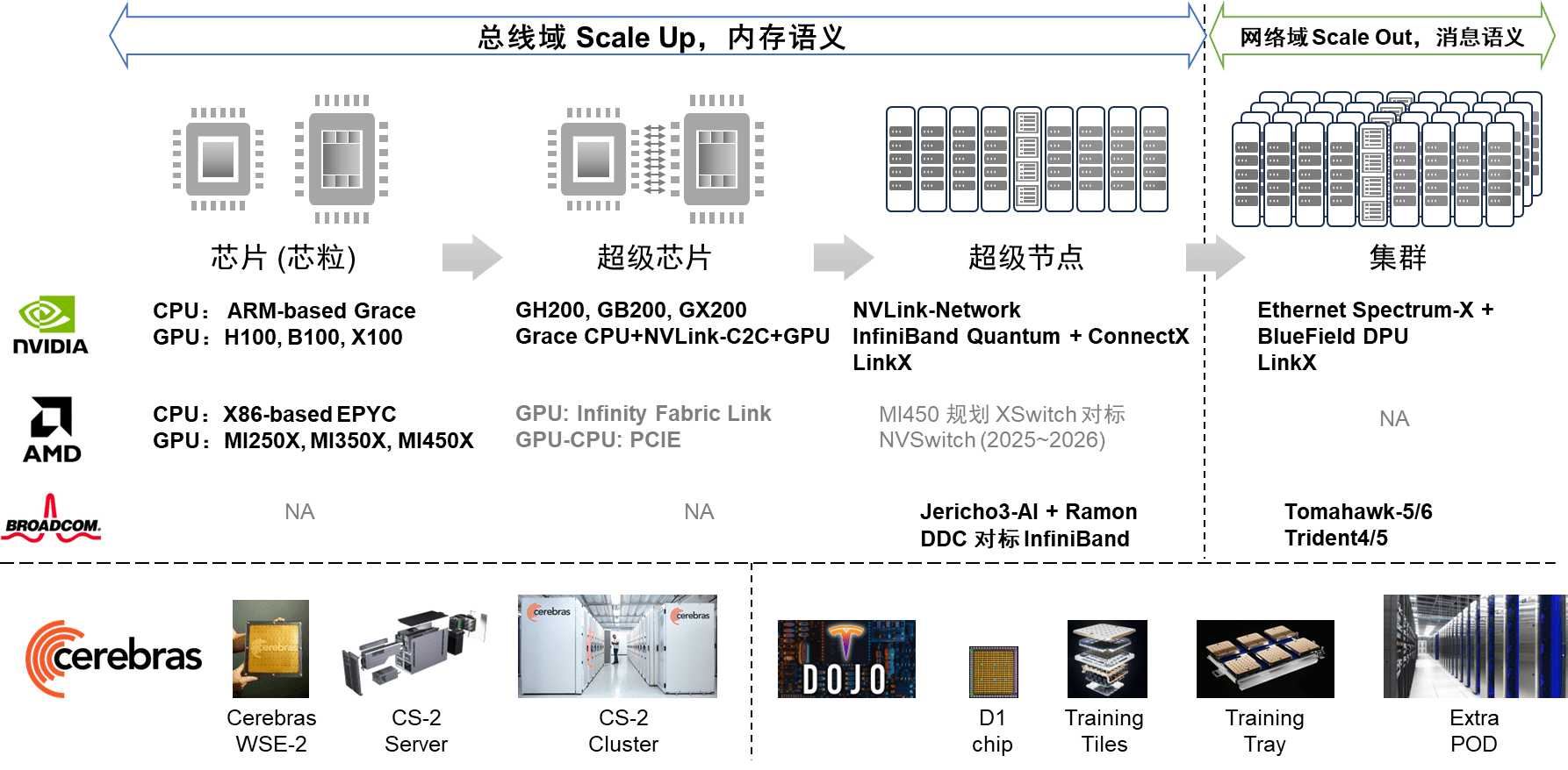 Nvidia在AI集群竞争态势中展现出了全面布局,涵盖了计算(芯片、超级芯片)和网络(超节点、集群)领域。在计算芯片方面,Nvidia拥有CPU、GPU、CPU-CPU/CPU-GPU SuperChip等全面的布局;在超节点网络层面,Nvidia提供了NVLink和InfiniBand两种定制化网络选项;在集群网络方面,Nvidia有基于Ethernet的交换芯片和DPU芯片布局。AMD紧随其后,更专注于CPU和GPU计算芯片,并采用基于先进封装的Chiplet芯粒技术。与Nvidia不同的是,AMD当前没有超级芯片的概念,而是采用了先进封装将CPU和GPU Die合封在一起。AMD使用私有的Infinity Fabric Link内存一致接口进行GPU、CPU、GPU和CPU间的互联,而GPU和CPU之间的互联仍然保留传统的PCIE连接方式。此外,AMD计划推出XSwitch交换芯片,下一代MI450加速器将利用新的互连结构,其目的显然是与Nvidia的NVSwitch竞争 [15]。BRCM则专注于网络领域,在超节点网络有对标InfiniBand的Jericho3-AI+Ramon的DDC方案;在集群网络领域有基于Ethernet的Tomahawk系列和Trident系列交换芯片。近期BRCM推出其新的软件可编程交换Trident 5-X12集成了NetGNT神经网络引擎实时识别网络流量信息,并调用拥塞控制技术来避免网络性能下降,提高网络效率和性能 [16]。Cerebras/Telsa Dojo则“剑走偏锋”,走依赖“晶圆级先进封装”的深度定制硬件路线。