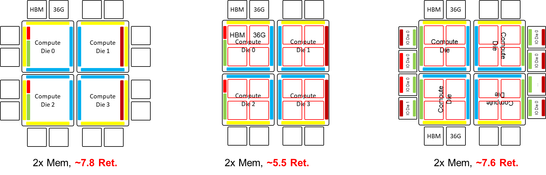 为了实现计算Die的归一化,可以将IO从计算Die中分离出来,形成独立的IO Die。这样,计算Die的互联接口就实现了归一化,使计算Die具备了旋转对称性。在这种情况下,仍然存在两种架构:一种是同构计算Die与IO Die合封,另一种是计算Die与IO Die分别封装并用C2C互联将二者连接。计算Die的同构最大的优势在于可以实现芯片的系列化。通过灵活组合计算Die和IO Die,可以实现不同规格的芯片以适应不同的应用场景的需求。