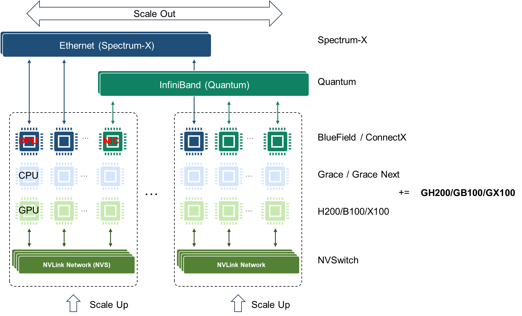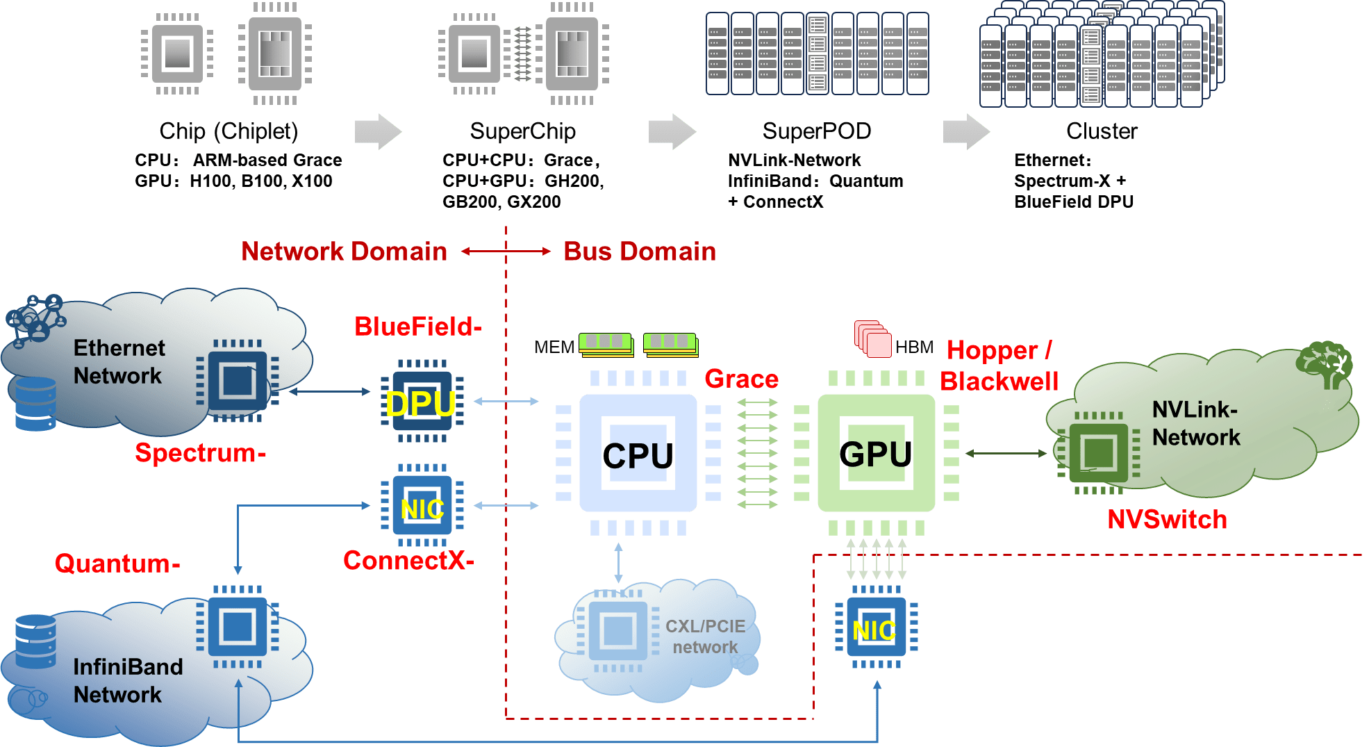 基于B100双Die架构,采用双Socket板级3D扩展可以实现与X100同等的算力。类似的方法也可以应用到X100中进一步扩展算力。板级扩展可以降低对工程工艺的要求,以较低的成本实现算力扩展。虽然基于人们对于先进封装的Chiplet芯粒架构充满了期待,但是其演进速度显然无法满足AI计算系统“三年三个数量级”的增长需求 [33]。在AI计算领域基于先进封装Die间互联Chiplet芯粒架构,很可能因为无法满足AI计算领域快速增长的需求而面临“二世而亡”的窘境,业界需要重新寻找旨在提升AI算力的新技术路径,比如SuperChip超级芯片和SuperPOD超节点。因此,类似于NVLink C2C的低时延、高可靠、高密度的芯片间互联技术在未来AI计算芯片的Scale Up算力扩展中将起到至关重要的作用;面向AI集群Scale Out算力扩展的互联技术也同等重要。这两中互联技术,前者是AI计算芯片算力扩展的基础,而后者是AI计算集群算力扩展的基础。