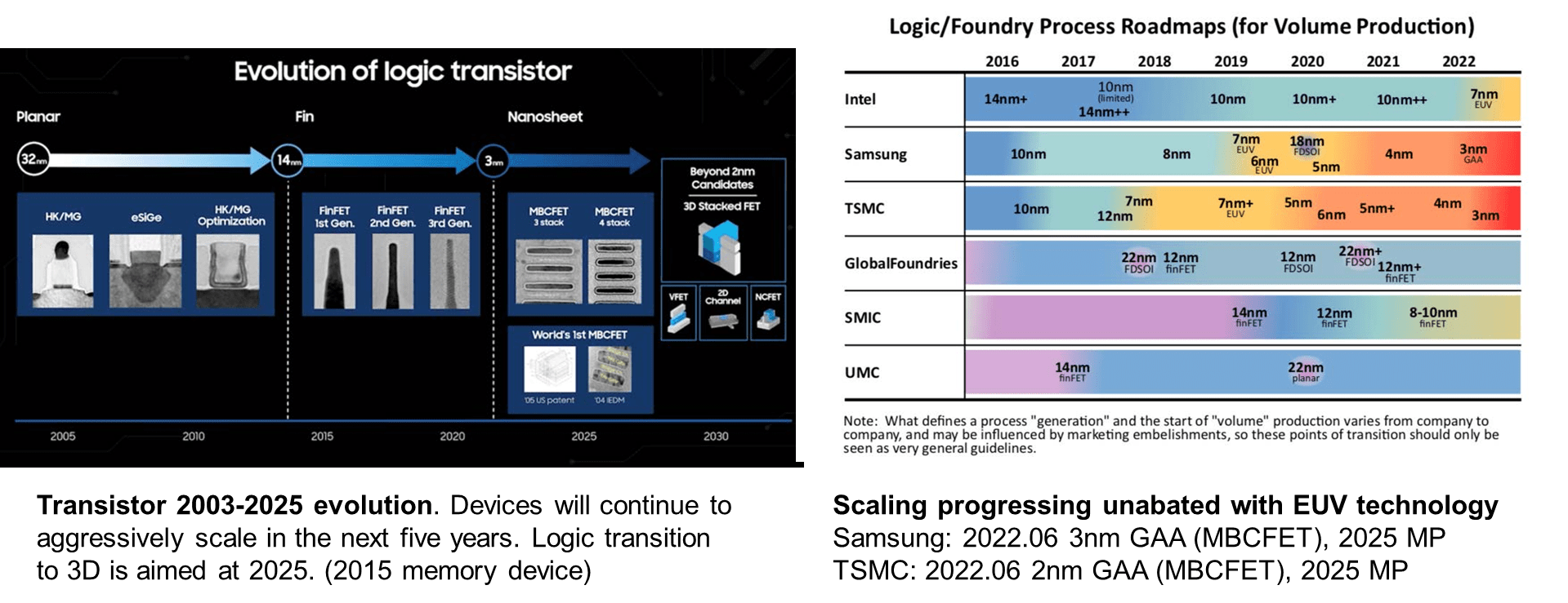根据IRDS的乐观预测,未来5年,逻辑器件的制造工艺仍将快速演进,2025年会初步实现Logic器件的3D集成。TSMC和Samsung将在2025年左右开始量产基于GAA (MBCFET)的2nm和3nm制程的产品 [17]。