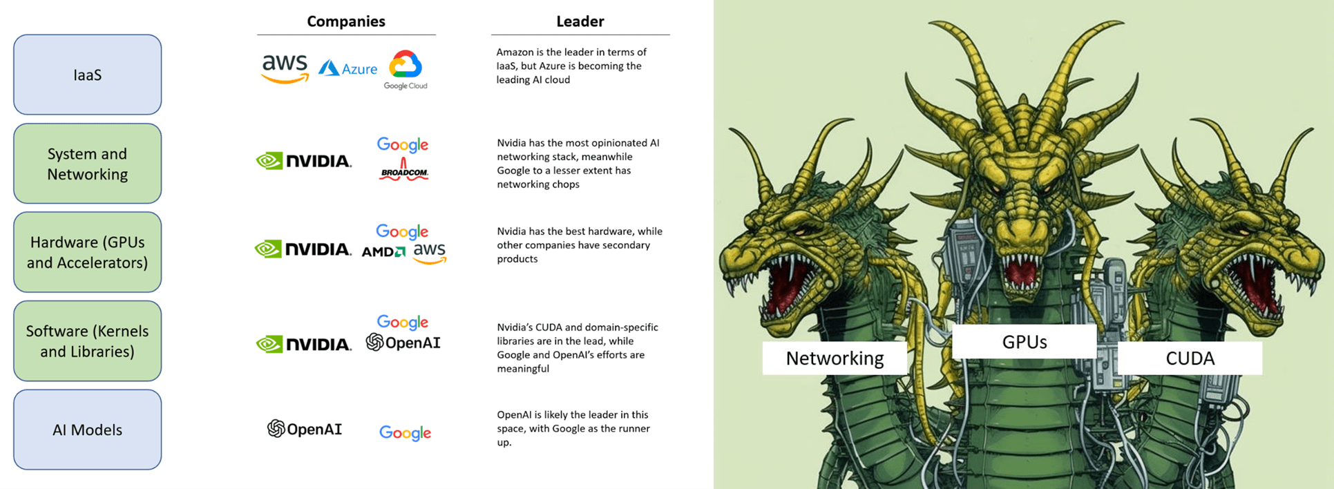 从业务视角看,Nvidia在系统和网络、硬件、软件三个方面占据了主导地位 [6]。系统和网络、硬件、软件这三个方面是人工智能价值链中许多大型参与者无法有效或快速复制的重要部分,这意味着Nvidia在整个生态系统中占据着主导地位。要击败Nvidia就像攻击一个多头蛇怪。必须同时切断所有三个头才有可能有机会,因为它的每个“头”都已经是各自领域的领导者,并且Nvidia正在努力改进和扩大其护城河。在一批人工智能硬件挑战者的失败中,可以看到,他们都提供了一种与Nvidia GPU相当或略好的硬件,但未能提供支持该硬件的软件生态和解决可扩展问题的方案。而Nvidia成功地做到了这一切,并成功抵挡住了一次冲击。这就是为什么Nvidia的战略像是一个三头水蛇怪,后来者必须同时击败他们在系统和网络、硬件以及软件方面的技术和生态护城河。目前,进入Nvidia平台似乎能够占据先机。OpenAI、微软和Nvidia显然处于领先地位。尽管Google和Amazon也在努力建立自己的生态系统,但Nvidia提供了更完整的硬件、软件和系统解决方案,使其成为最具吸引力的选择。要赢得先机,就必须进入其硬件、软件和系统级业务生态。然而,这也意味着进一步被锁定,未来更难撼动其地位。从Google和Amazon等公司的角度来看,如果不选择接入Nvidia的生态系统,可能会失去先机;而如果选择接入,则可能意味着失去未来。