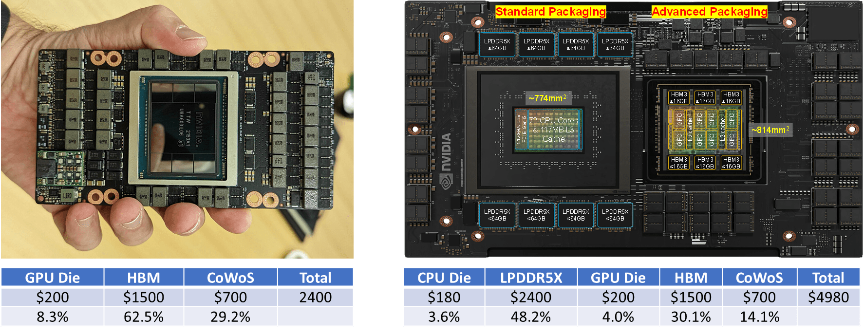 先进封装成本高,是逻辑芯片裸Die成本的3 到4倍以上, GPU内存的成本占比超过 60%。按照DDR: 5美金/GB,HBM: 15美金/GB以及参考文献 [25][26] 中给出的GPU计算Die和先进封装的成本测算,H100 GPU HBM成本占比为62.5%;GH200中HBM和LPDDR的成本占比为78.2%。
