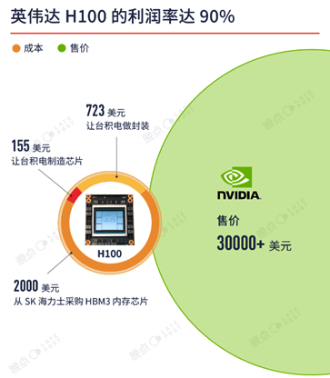 有媒体测算Nvidia的H100利润率达到90%。同时也给出了估算的H100的成本构成,Nvidia向台积电下订单,用 N4工艺制造 GPU 芯片,平均每颗成本 155 美元。Nvidia从 SK 海力士(未来可能有三星、美光)采购六颗 HBM3芯片,成本大概 2000 美元。台积电生产出来的 GPU 和Nvidia采购的 HBM3 芯片,一起送到台积电 CoWoS 封装产线,以性能折损最小的方式加工成 H100,成本大约 723 美元 [24]。